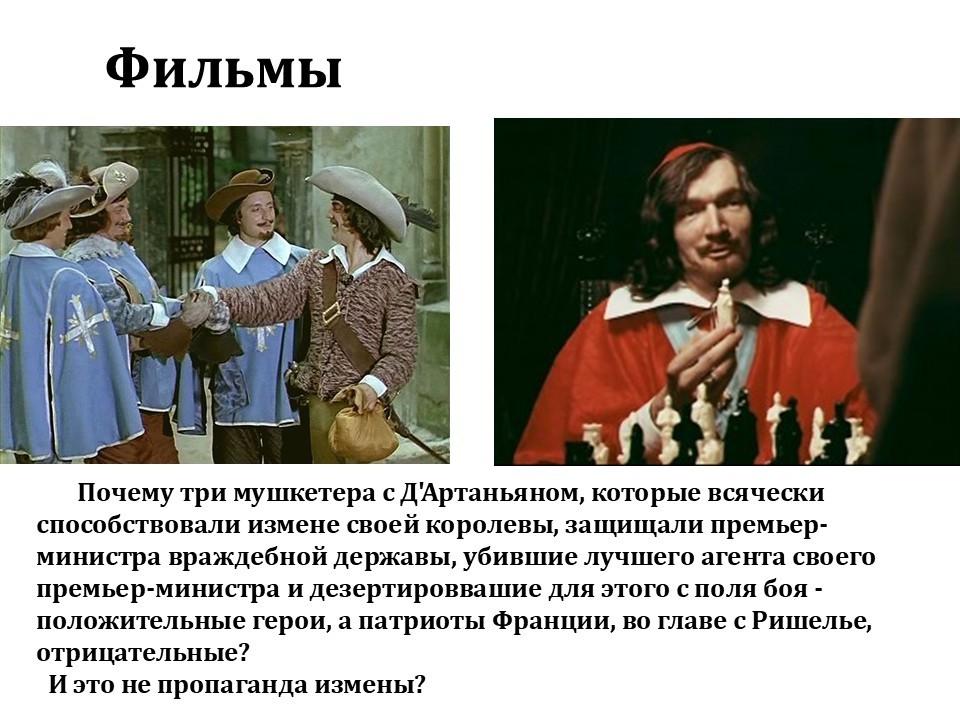 Какое количество людей понимают, что эти герои – изменники? Вспомните предыдущие слайды: один процент понимает, пять процентов догадываются, девяносто четыре процента счастливо улыбаются. Во Франции дошли до абсурда: там есть Почетный орден мушкетёров. Туда принимают достойнейших людей, дают им звание мушкетёра, не понимая, что эти четыре мушкетёра и были теми самыми, кто предал страну.