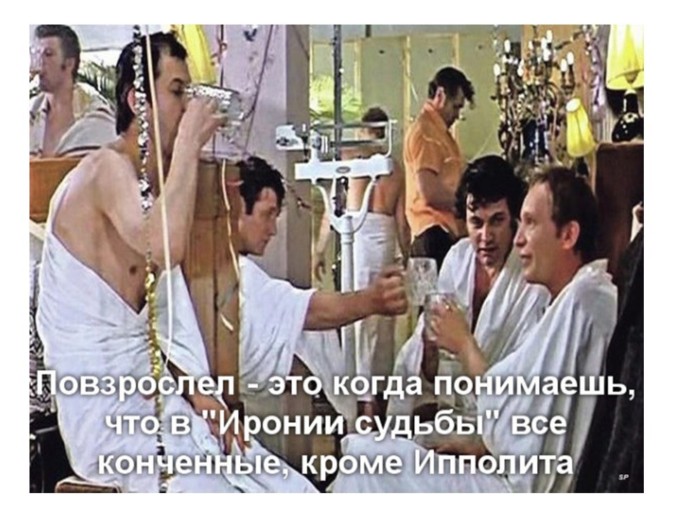 Первая аудитория – мужчины-выпивохи. Для них это фильм самоутверждения. Знай наших, мы хоть и напьёмся, как свиньи, но всё равно победим любого «правильного» Ипполита и невесту уведём у него так, что она к нам в город приедет, чтобы веник для бани привезти.