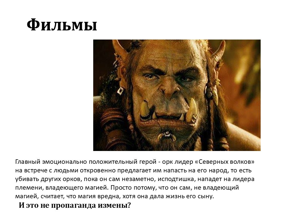 Это то, что прямо сейчас вкладывается в наше сознание. Никто в фильме не говорит, что этот орк предатель поганый. Напротив, его изображают хорошим.