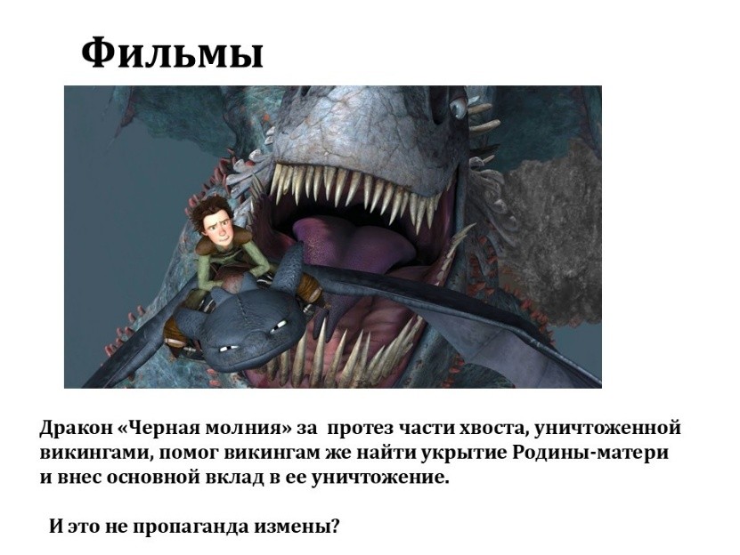 Дракон Ночная Фурия не просто помогает врагам драконов, людям, а именно в процессе войны людей с драконами показывает им главный штаб, гнездо, самую уязвимую точку своей популяции драконов. Помогает найти родину-мать, изображённую некрасивой, чтобы мы ей не сопереживали, а сопереживали красивым людям и красивому дракону Ночной Фурии.