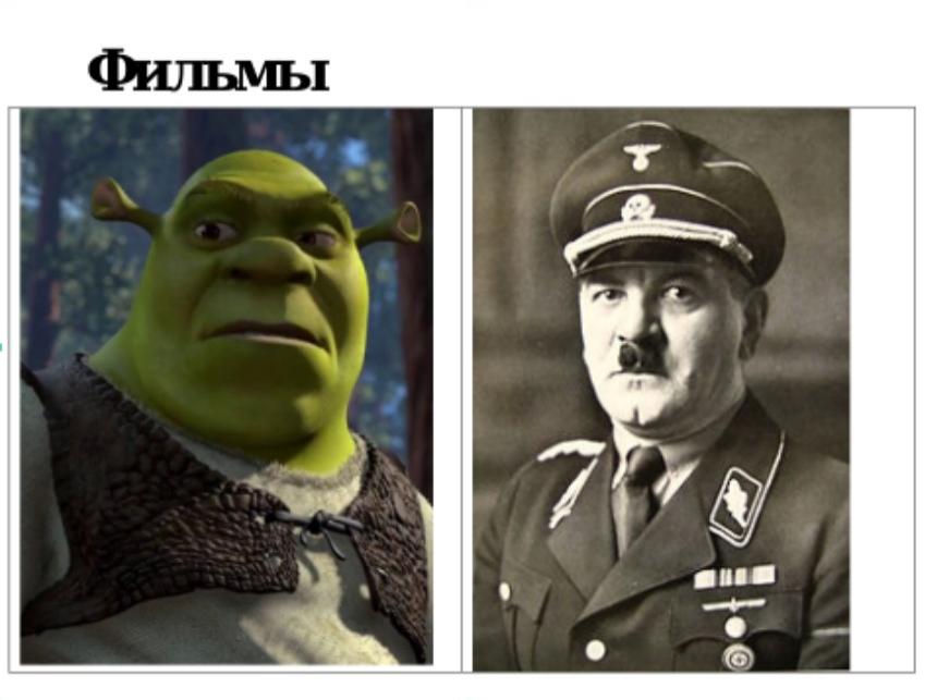 Сравните внешность. Да, у Шрека нет «нацистских» усов. Тогда прямо сразу всё было бы понятно. И уши другие. Но явно ведь сходство есть. Почувствуйте, как всё это работает. Это и есть та самая эмоциональная завеса.