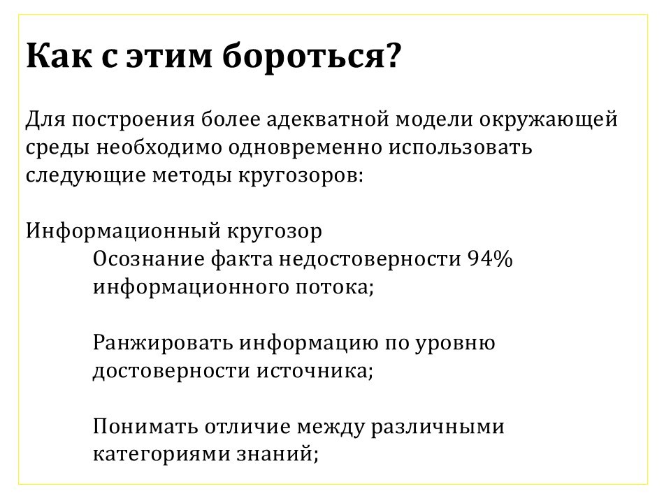 Кругозор ситуативный заключается в том, что нужно искать и анализировать, условно говоря, не совсем запрещённую информацию, а ту информацию, которую нам не рассказывают.