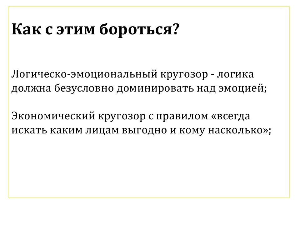 Логико-эмоциональный кругозор. Логика должна доминировать над эмоцией. Это большая интересная тема. Она не так проста, как кажется изначально. Мы в четвертой лекции обсудили эмоциональную завесу. Она оказалась существенно сложнее, чем мы думали раньше. Также и здесь.