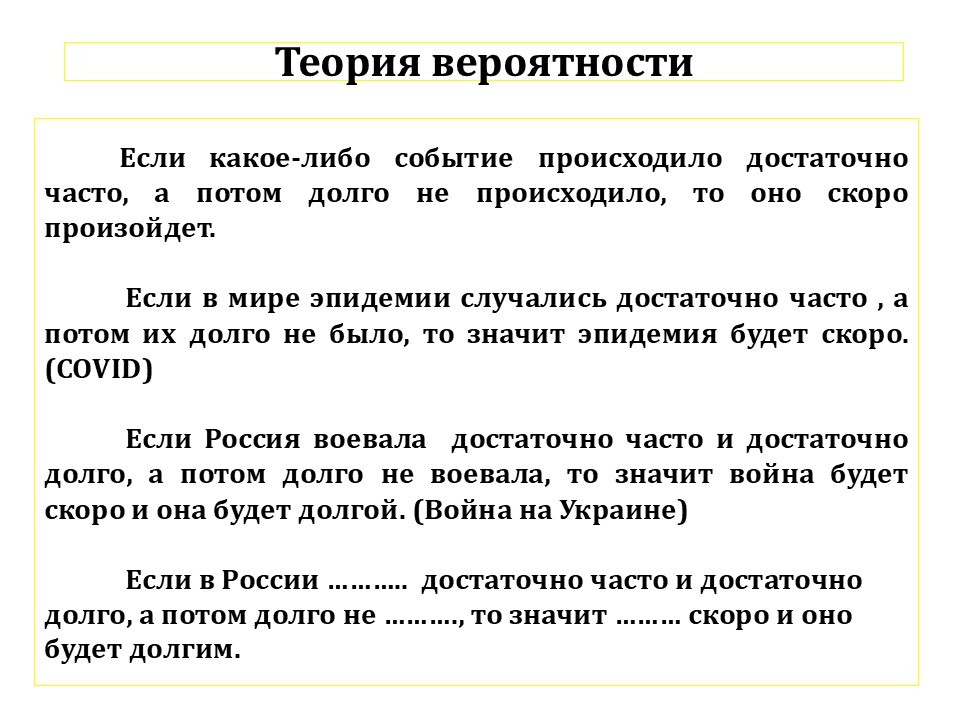 Так и произошло. СВО на Украине началась в полном соответствии с теорией вероятности и идет уже долго. Судя по высказываниям европейских политиков, война на Украине не только будет идти очень долго, но и перейдет на территорию Восточной и Северной Европы.