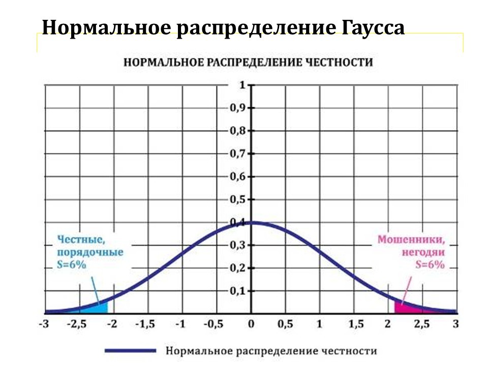 Так «работает» нормальное распределение Гаусса. Оно касается не только честности и интеллекта. Какую бы черту мы ни взяли – везде «работает» одинаково. Возьмём рост: 6 % людей – маленькие, ниже нормы и 6 % – выше нормы, дылдами их обычно называют. То же самое с весом. То же самое с количеством волос. Любой показатель, который бы мы ни взяли – в живой или неживой природе, – подчиняется распределению Гаусса.