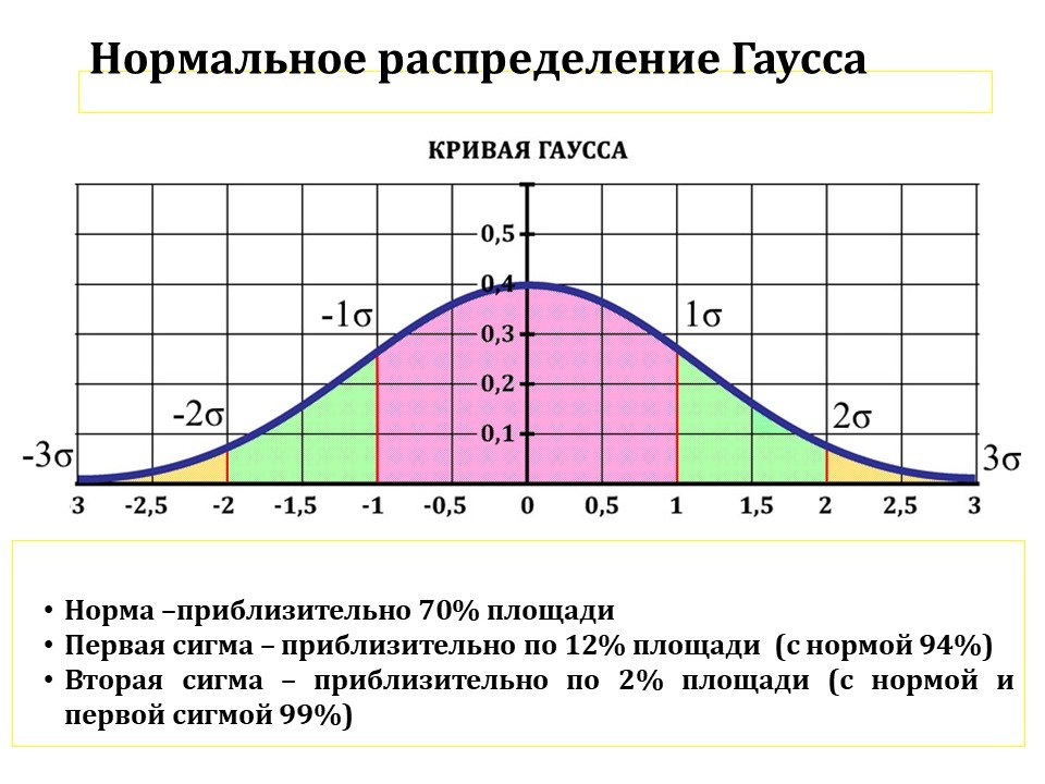 И когда математики стали анализировать эту кривую Гаусса, они пришли к следующему выводу: приблизительно 70 % площади (покрашенное фиолетовым) – это середина, это нормально. Если событие попало туда, с небольшим отклонением, так называемая «единичка» – это нормальное событие. Если отклонение ушло чуть-чуть вправо или влево – это приблизительно 12 % площади (покрашенное зелёным). Это называется первая сигма – несущественная ошибка.