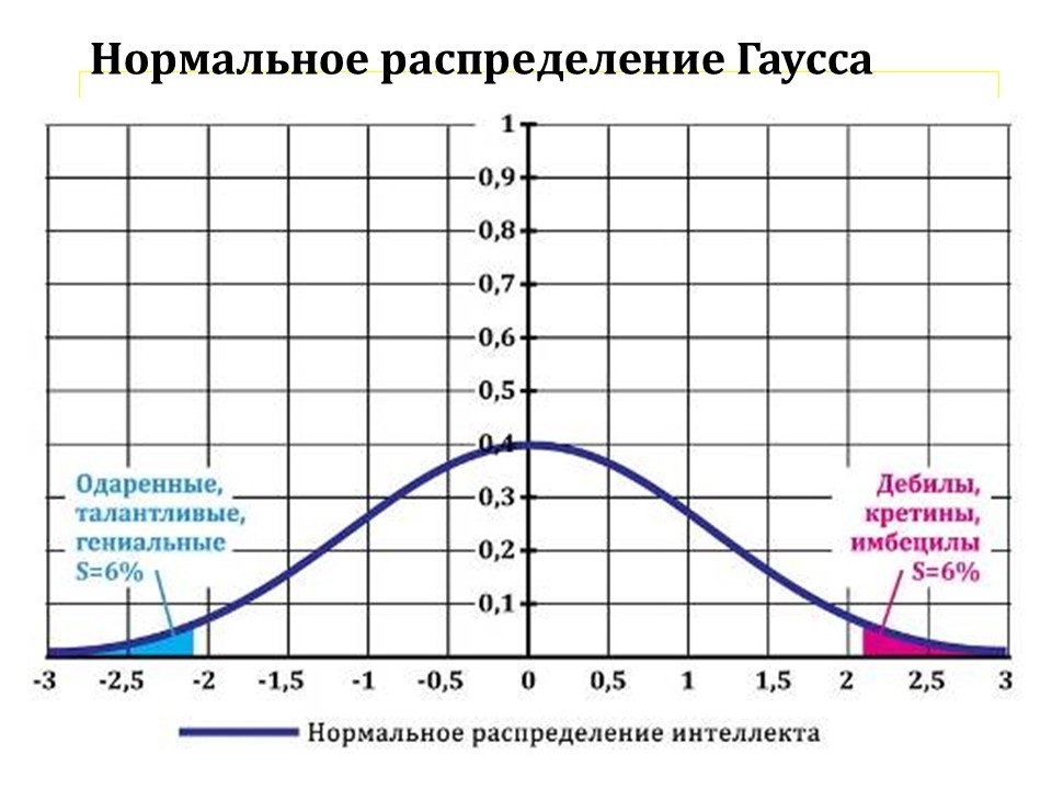 Обратите внимание: социологи, зная или не зная нормального распределения Гаусса, говорят, что 6 % отличаются от нормы. И те, у кого IQ ниже 70, не «нормальные». И те, кто одарён, тоже нормой не являются. В смысле распределения Гаусса они ненормальные люди. Не в медицинском смысле, а в математическом, статистическом.