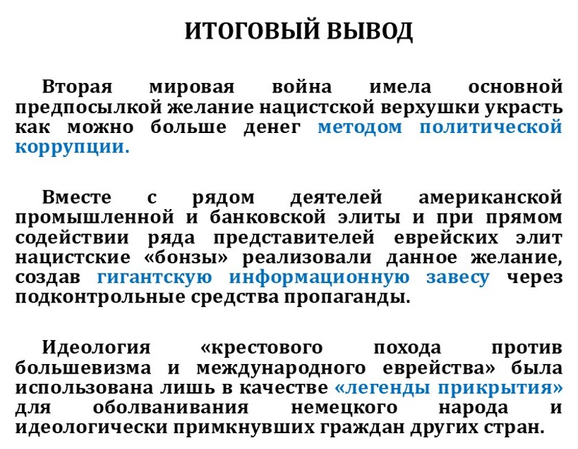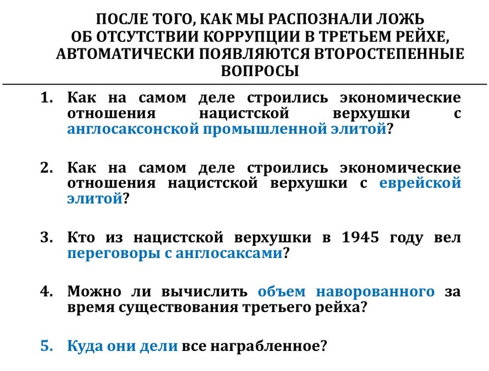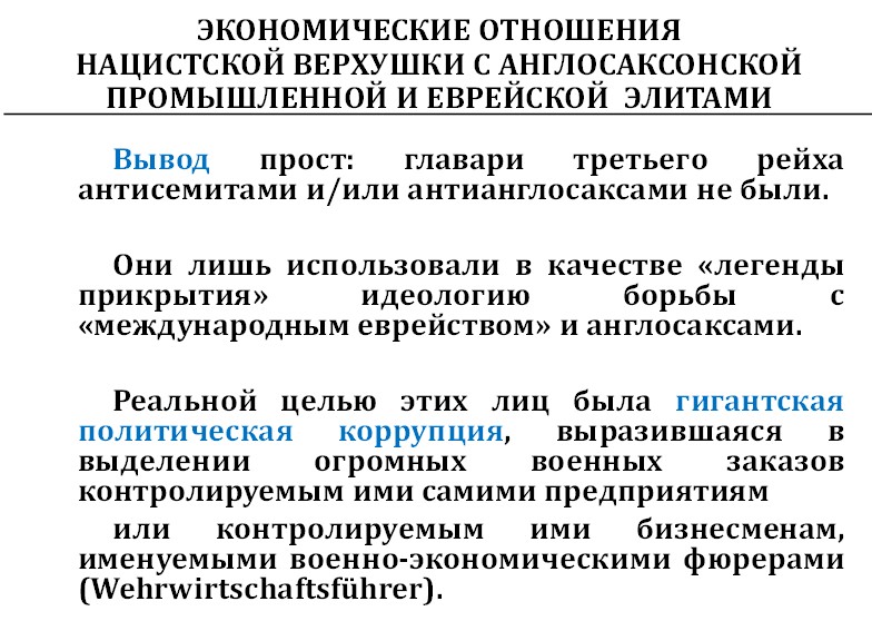 На самом деле, как только мы поймём, что интересы были исключительно экономические и идеология нацизма была лишь идеологией прикрытия, чтобы заставить этих двуногих баранов идти на войну и там погибать, с этого момента начинается понимание того, как работает система управления Третьего рейха.