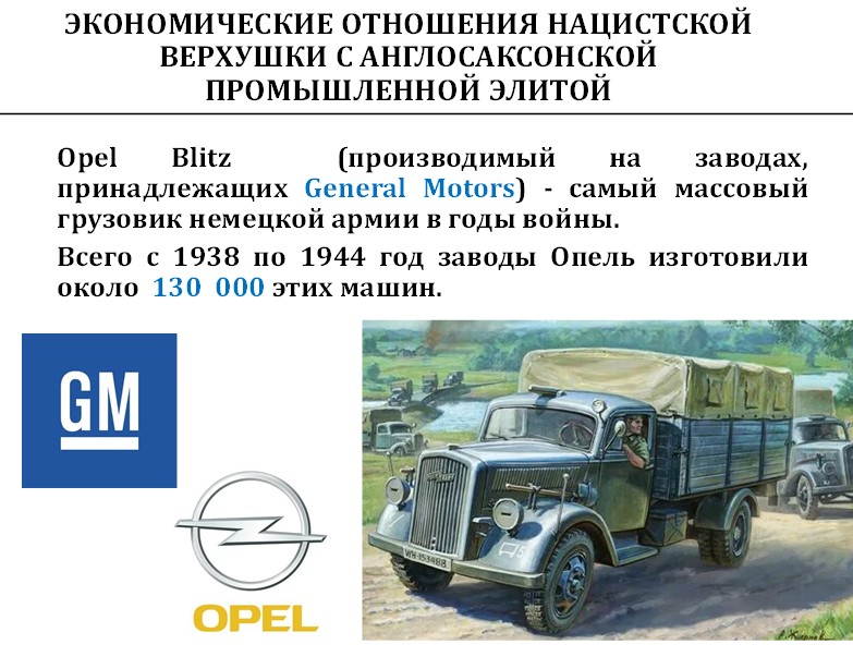 Грузовики «Опель Блиц» – самый массовый грузовик немецкой армии. С нашей стороны самым массовым грузовиком в РККА был «Студебеккер». Таким образом, война велась с двух сторон автомобилями, произведёнными де-факто американцами. Сказать, что американцы были одной из сторон конфликта, невозможно. Они экономически были по обе стороны и зарабатывали, поставляя продукцию внутри Америки, зарабатывали, поставляя по ленд-лизу в Англию, зарабатывали, поставляя по ленд-лизу в Россию, и зарабатывали, ещё будучи акционерами внутри германской экономики.