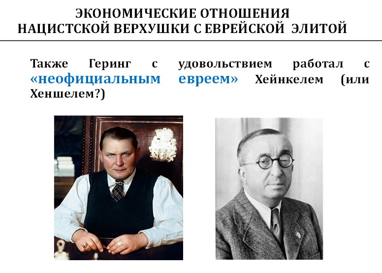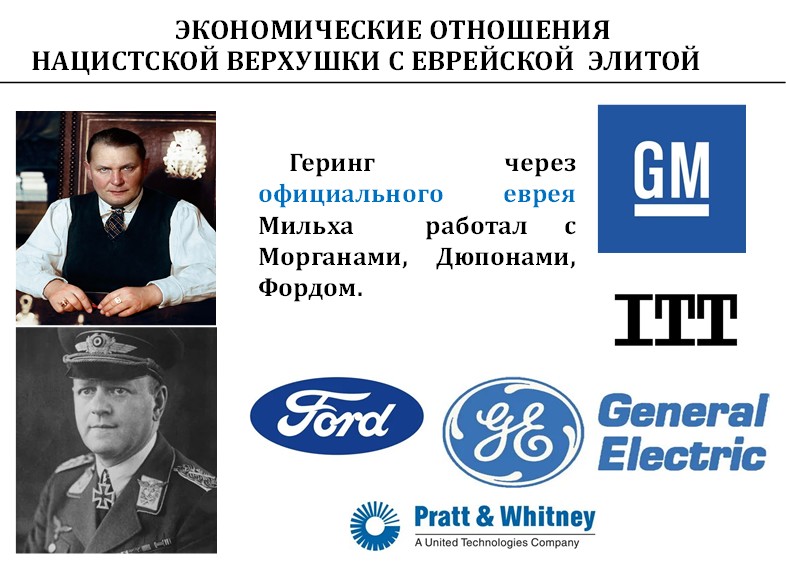 А экономические отношения были такие, что Геринг через официального еврея Мильха работал с Морганами, Дюпонами, Фордом. И у него была прямая связка с Рокфеллерами.