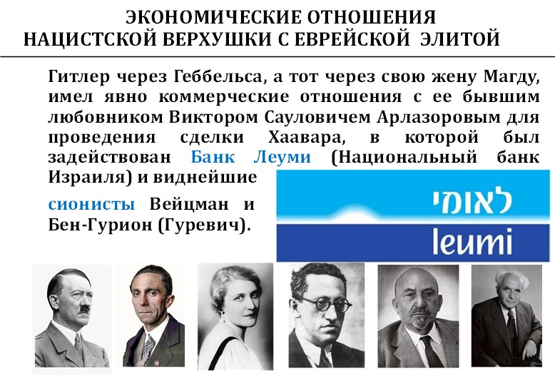Соглашение Хаавара, которое мы рассматривали, даёт следующую информационную и экономическую цепочку: Гитлер – Геббельс – Магда Геббельс – Хаим Арлозоров (из пригорода Сум) – очень известные сионисты Вейцман (из Гродно) и Бен-Гурион (Гуревич из Житомира). Также соглашением Хаавара занимался еврей Макс Мориц Варбург из очень богатой банковской семьи Варбургов, партнеров евреев Ротшильдов. Вот она, связь, которую разорвать невозможно. Эти люди были тесно связаны через эту цепь.