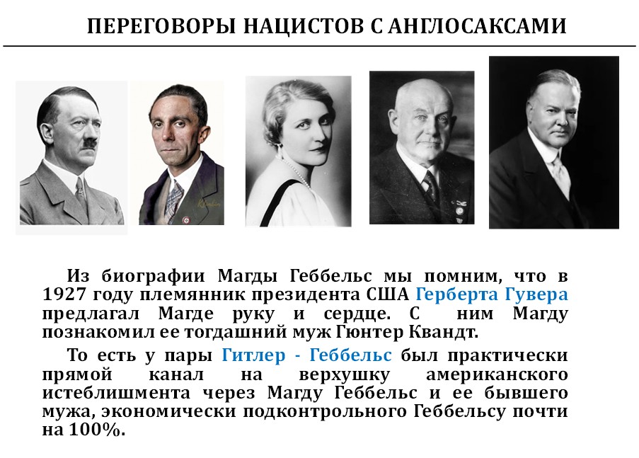 предложили Гитлеру и Геббельсу (ориентировочно через Магду Геббельс) притормозить германский ядерный проект, а также иные явно антиамериканские проекты: межконтинентальные баллистические ракеты, суборбитальный перехватчик и т. д. – в обмен на личную и финансовую неприкосновенность после войны.