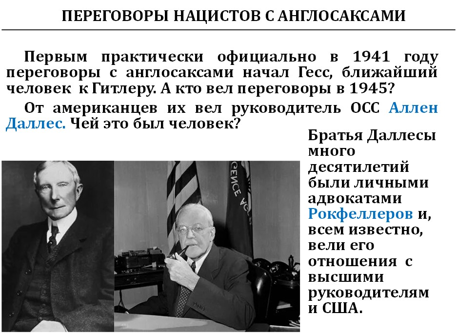 Когда в 1942 году немцы построили ядерный реактор раньше американцев, Рокфеллеры организовали на нём аварию, использовав как возможности адвоката-разведчика Даллеса, так и свои возможности внутри Германии.