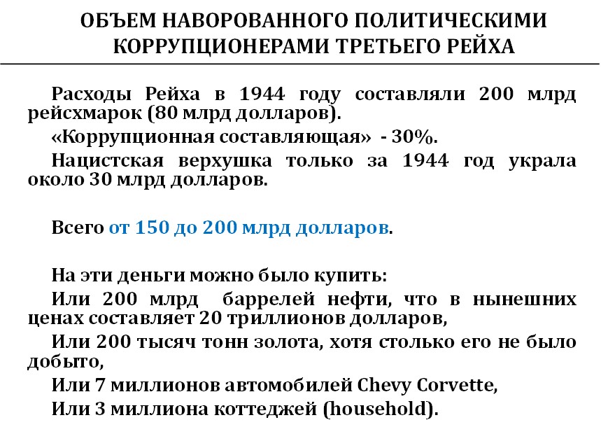 А сколько приблизительно наворовали нацисты? Вот только приблизительно: расходы Третьего рейха в год составляли около 80 миллиардов долларов, и коррупционная составляющая во время войны, наверное, составляла около 30 %.