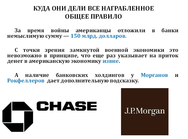 Каналы ввоза в Америку были у Рокфеллера, у Морганов, Дюпонов, Варбургов. Ну и, понятно, Ватикано-Католической группы, которую достаточно громко обвиняют в связях с нацистами. У Рокфеллера был банк Chase, через который могли проходить деньги, у Моргана – J.P. Morgan. А Пол Варбург вообще был основателем Федеральной резервной системы США и обладал почти неограниченным влиянием в ее банковском секторе.
