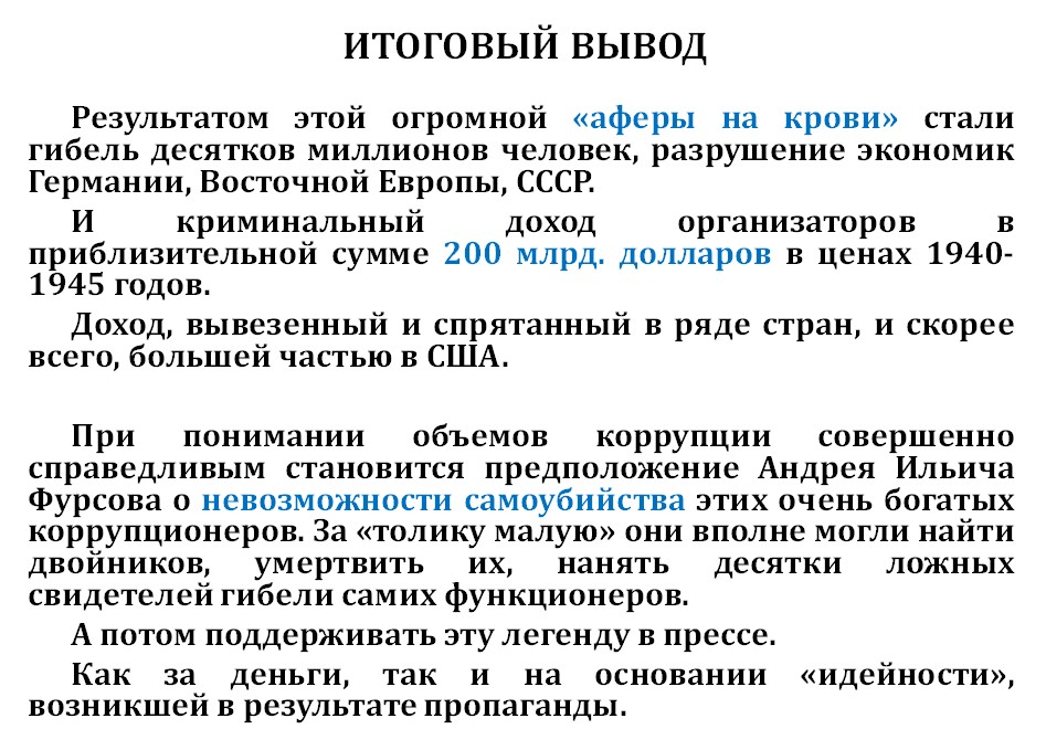 Но в экономическом смысле эти люди работали вместе и вместе делили эти нелегальные прибыли. Главари Третьего рейха не были ни антисемитами, ни антианглосаксами. Их целью была гигантская политическая коррупция.