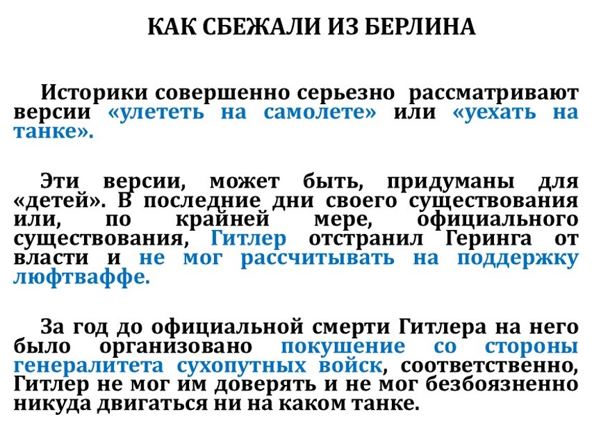 Как они могли улететь на самолёте, если Гитлер в последние дни отстранил Геринга от власти и даже собирался его расстрелять? Кто бы из люфтваффе Гитлера повёз? Лётчики любили Геринга, и любили его существенно больше, чем Гитлера.