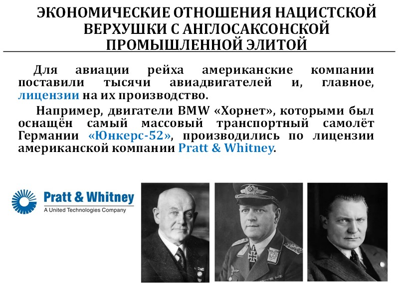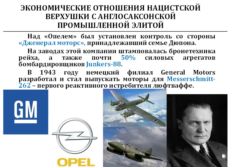 Половина силовых агрегатов Юнкерса и реактивного Мессершмитта 262, выпускались в немецком филиале «Дженерал Моторс». Это была единая группа лиц.
