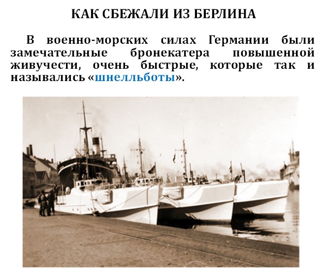 При этом никто никогда не рассказывает, что через город Берлин течёт полноводная речка под названием Шпрее. Карл Дёниц был самым преданным Гитлеру человеком и до последнего оборонялся в устье Эльбы. По этой Шпрее можно было легко уплыть на маленькой подводной лодке типа Seehund, которая была у немцев, или на торпедных катерах, которые назывались «шнелльботы».