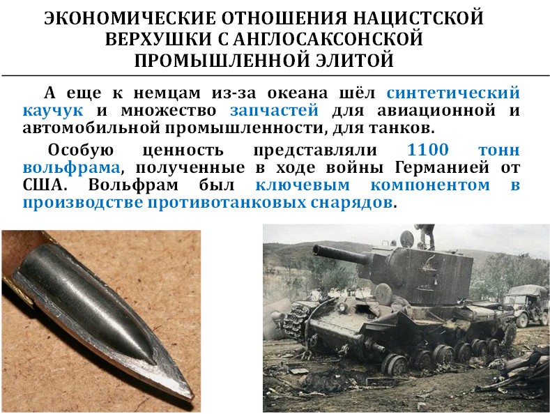 Без вольфрама противотанковых подкалиберных снарядов не было бы совсем. И вольфрам был получен немцами от англосаксов. И потом этими подкалиберными снарядами немцы стреляли по нашим танкам КВ-1 и КВ-2. То есть немцы не могли бы подбивать наши танки КВ-1 и КВ-2, если бы англосаксы не поставляли им вольфрам.