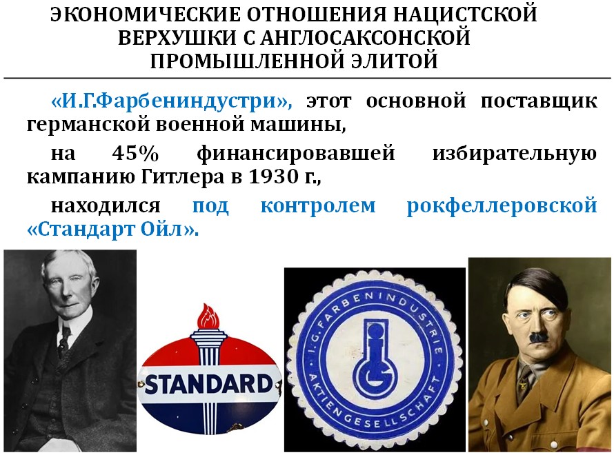 Связь, конечно же, прямая: через IG Farben Гитлер, Шпеер, Геринг легко контактировали с Рокфеллерами, которые контролировали политическую власть в Америке.