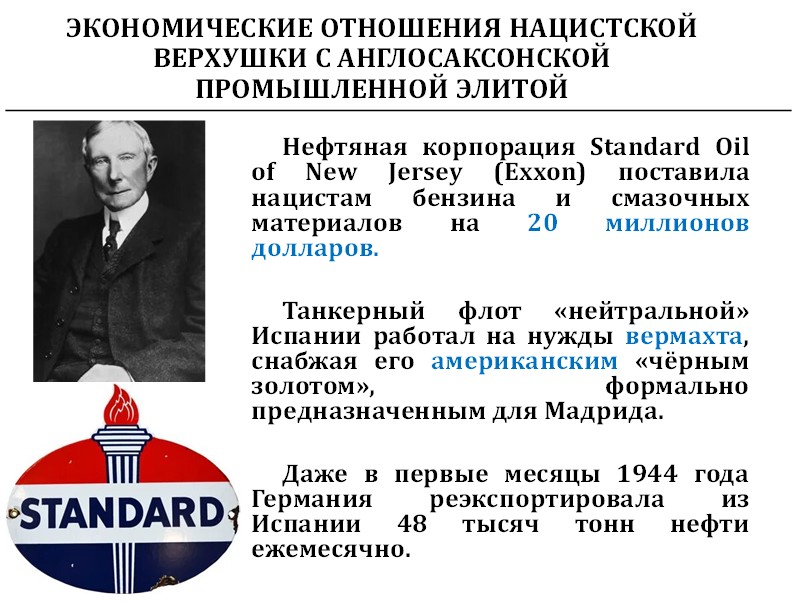 Итак, «И. Г. Фарбениндустри», основной производитель синтетического бензина, контролировался де-факто Рокфеллерами. Поэтому, чем больше немецкие танки ездили на Восточном фронте, тем больше денег было у американского промышленника Рокфеллера.