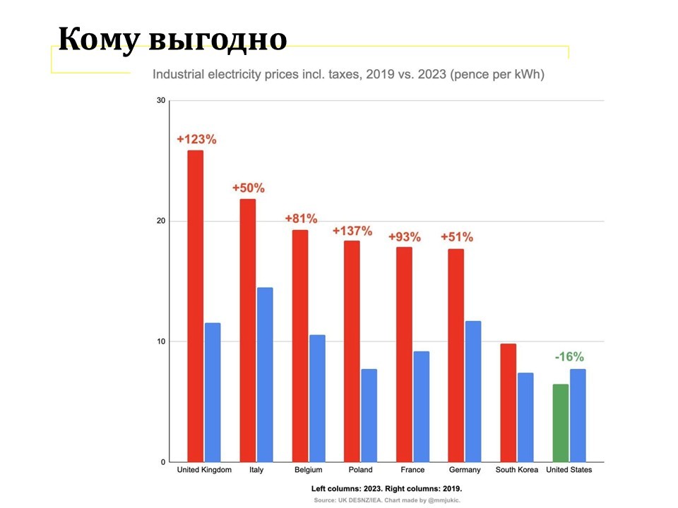 А кому выгодно? Мы сейчас уже более-менее видим статистику и можем понимать, кому выгодно. На слайде показаны изменения цен на электричество с 2019 по 2023 год по странам. Сначала Англия, Италия, Бельгия. Потом Польша, Франция, Германия, Южная Корея и Америка. Вот так изменились цены на электричество. Во всех странах Европы цена на электричество выросла – где на 90 %, где на 50 %, где на 100 %.