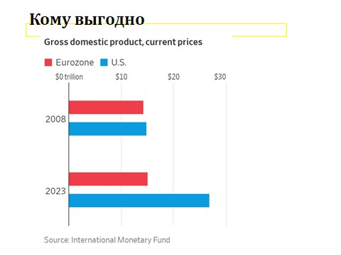 Кроме того, GDP, по-русски называемый ВВП, – валовый продукт страны – в 2008 году у еврозоны и у Америки был приблизительно одинаковый, а сейчас отличается почти на 50 %. Вот результат, который произошёл. Правда, из еврозоны ещё Англия вышла, но это, конечно, намного меньший эффект дало, чтобы привести к такому результату.