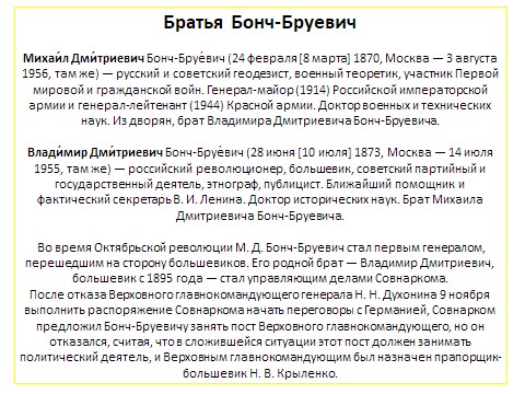 | Михаи́л Дми́триевич Бонч-Бруе́вич (24 февраля [8 марта] 1870, Москва – 3 августа 1956, там же) – русский и советский геодезист, военный теоретик, участник Первой мировой и гражданской войн. Генерал-майор (1914) Российской императорской армии и генерал-лейтенант (1944) Красной армии. Доктор военных и технических наук. Из дворян, брат Владимира Дмитриевича Бонч-Бруевича. | Влади́мир Дми́триевич Бонч-Бруе́вич (28 июня [10 июля] 1873, Москва – 14 июля 1955, там же) – российский революционер, большевик, советский партийный и государственный деятель, этнограф, публицист. Ближайший помощник и фактический секретарь В. И. Ленина. Доктор исторических наук. Брат Михаила Дмитриевича Бонч-Бруевича. | |