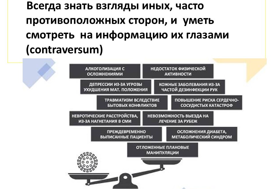 Вот пример, который был очень актуален буквально несколько лет назад. С одной стороны – COVID, с которым надо бороться, а с другой стороны – на весах: