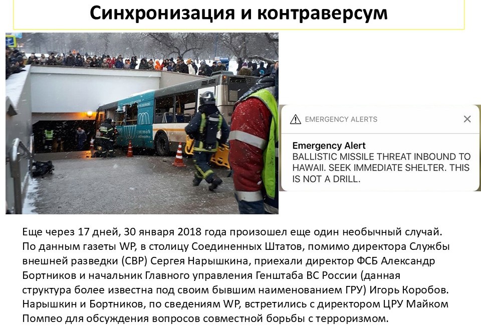 Но ещё через 17 дней, 30 января, в Соединённые Штаты приехали Сергей Нарышкин, директор СВР, директор ФСБ Бортников и директор ГРУ Игорь Коробов. Они встречались с директором ЦРУ для обсуждения вопросов по терроризму. Это стало известно, потому что в парламенте США выступил конгрессмен и сказал, что «эти люди внесены в список запрета на въезд в США. Мы принимали дружное решение не пускать их никогда в Америку. Как они к нам сюда попали?» Вопрос он, конечно, задал, но никто ему даже и не собирался отвечать.