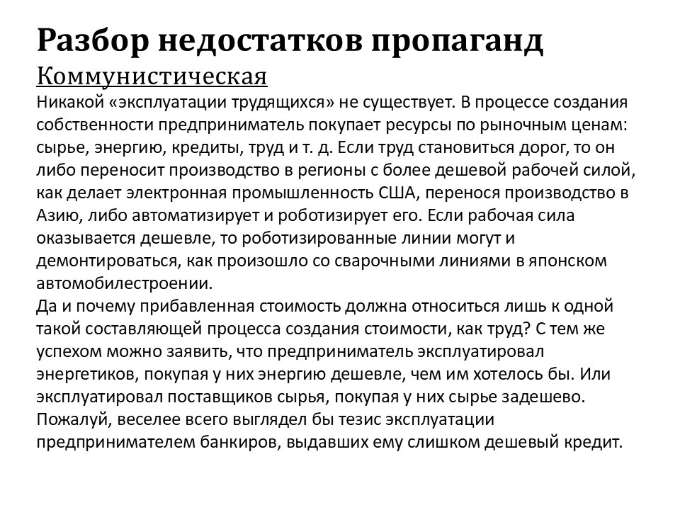 Поэтому любой человек, у которого есть какая-либо собственность, прекрасно понимает, что сама она в стоимости не возрастает. Даже если у вас есть только какой-то дом, за ним надо всё время приглядывать: где-то что-то прибить, где-то что-то починить, соседи могут поджечь, или бомжи могут залезть, кто-то может его обчистить и так далее. Поэтому, если просто критически воспринимать то, что написано было в марксистской идеологии, оно, в общем, честно говоря, только смех вызывало.
