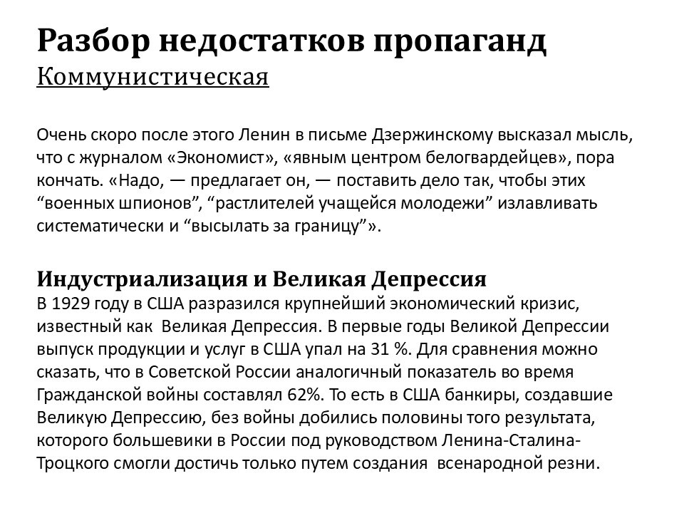 Население работало за гроши. И первое время пыталось бунтовать. Рабочие говорили: «Ну как же так? При царе мы жили в 4–5 раз лучше». В ответ были изданы законы о саботаже и вредительстве. И нарком Дзержинский в своё время занимался тем, что расстреливал рабочих паровозных депо, которые отказывались водить паровозы. Их называл саботажниками и вредителями. Об этом есть исторические факты, их надо только посмотреть.