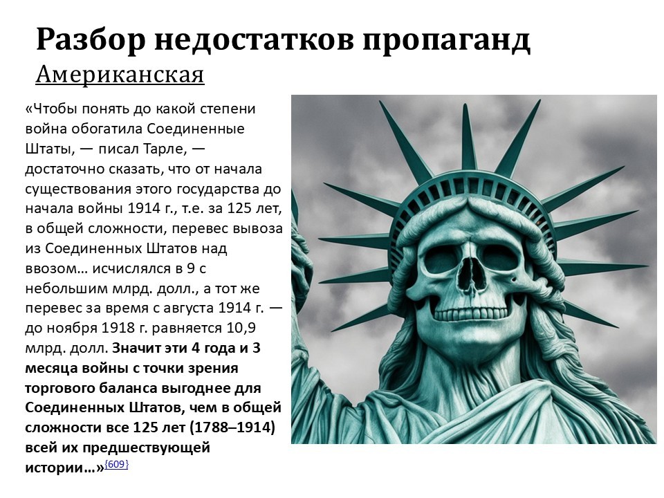 Для того чтобы понять экономические основы американской пропаганды, необходимо почитать писателя Тарле.