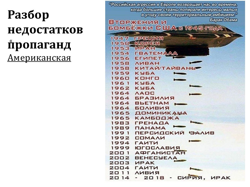 На слайде достаточно старая картинка, заканчивается 2014 годом. Показано, в каком количестве конфликтов поучаствовали американцы.