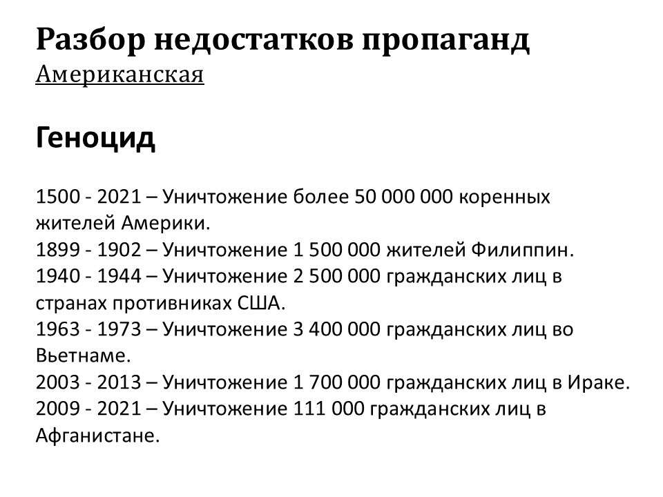 Я ещё раз напомню: у них 4 миллиона ветеранов. При том, что официально Америка ни в каких военных действиях не участвовала. Но 4 миллиона ветеранов откуда-то взялись. Откуда? Стран столько, что на одну страничку не помещаются. Один только перечень, где они умудрились позаниматься своим этим «замечательным» делом.