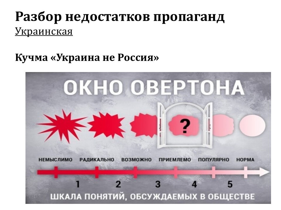 | Пропаганда измены - окна Овертона | Царя заставили отречься Рузский и генералы, народ убедили быть верным не «Отечеству», а «Интернационалу трудящихся»; у народа отняли христианскую веру и стали заменять верой в околохристианское учение – марксизм-коммунизм. | Народ убедили свергнуть легального президента Януковича, народ убедили быть верным не «Отечеству», а «Европе», убедили, что все поддерживающие интеграцию с Россией, особенно жители Донбасса – де-факто унтерменши «ватники». |