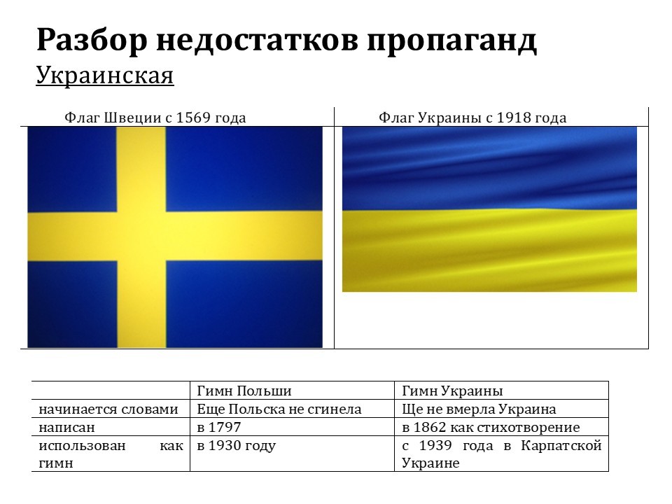 Те, кто смеётся над Украиной, говорят, что они подобрали под Полтавой обрывки шведских флагов после того, как русские разгромили Карла XII. На самом деле, это почти правда. Потому что, когда они изменили России и воевали на стороне Карла XII, они в петлички себе вставляли сине-жёлтые ленточки, чтобы как-то отличаться. Вот, действительно, они флага своего тогда не имели совсем.