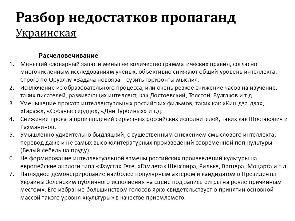Во-первых, язык. В «мове» просто на треть меньше слов, чем в русском языке. Некоторые считают, что вдвое. Соответственно, мозг человека зависит от богатства языка. И если словарный запас меньше, то человек глупее. Помните Эллочку-людоедку в «Двенадцати стульях» Ильфа и Петрова? Ей хватало 30 слов словарного запаса. Ильф и Петров таким образом хотели показать, что она была исключительно глупа.