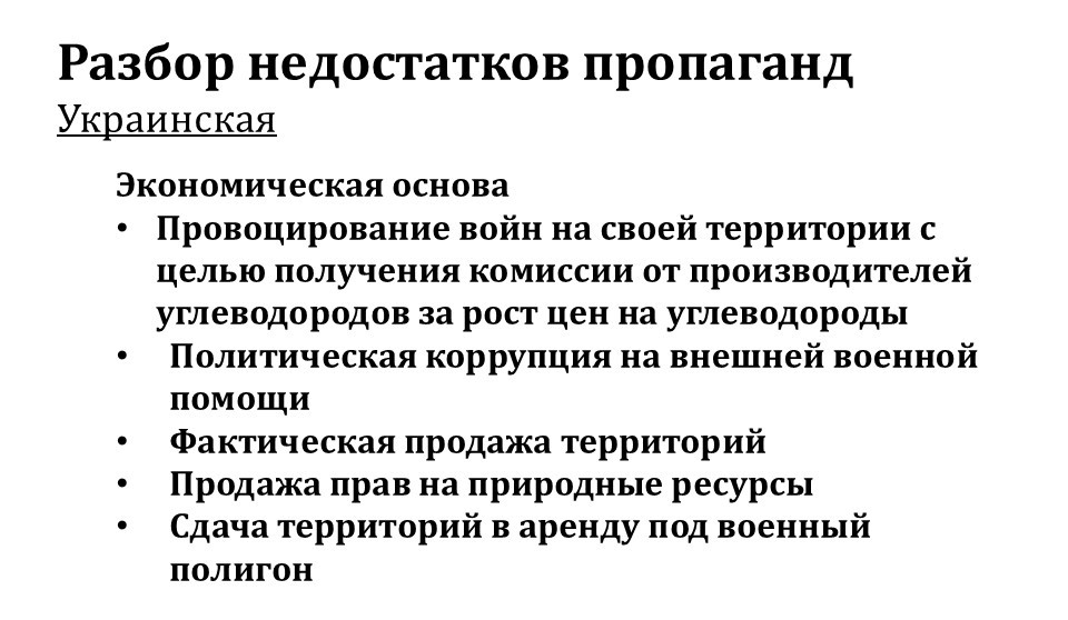 | Обман | Экономически неграмотные слои обманули якобы «эксплуатацией капиталистами», умолчав об огромной прибавочной стоимости качественного управления. Исключение экономически и управленчески грамотной элиты привело к коллапсу промышленности. | Экономически неграмотные слои обманули якобы «эксплуатацией Россией», умолчав об огромной прибавочной стоимости цепочек производства и международной кооперации с Россией. Разрыв цепочек производства с Россией привел к коллапсу промышленности. |