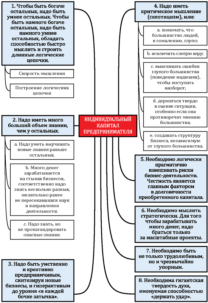 Интеллектуальный капитал предпринимателя — это и понимание потребностей рынка; и умение дорого продать произведенную продукцию; и понимание рынка комплектующих; и умение дешево купить сырье, организовать непрерывные его поставки; и умение правильно кредитоваться; и умение управлять трудовым коллективом; и умение сохранить ноу-хау и многое другое.