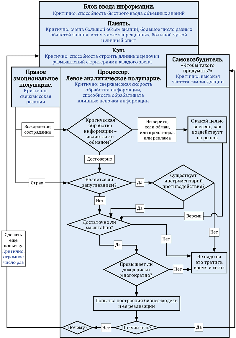 Моделируя мозг миллиардера, можно представить его в виде некоего абстрактного компьютера с определенными минимально необходимыми для выполнения задачи требованиями как к hardware — составу и характеристикам мозга, так и к sоftware — алгоритму принятия бизнес-решений, гарантированно ведущих к ее решению — суперуспеху, зарабатыванию миллиарда.