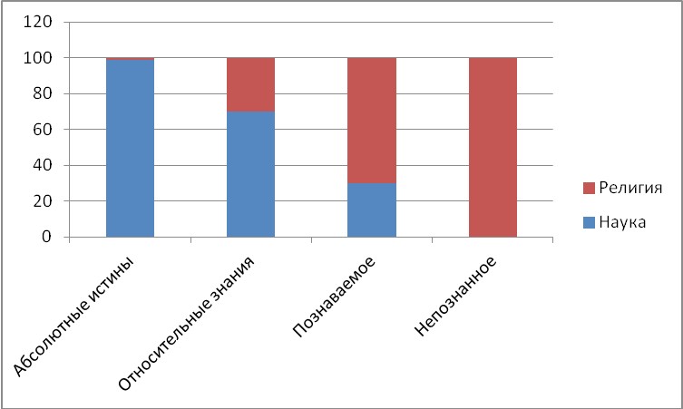 Применить религию к абсолютным знаниям и к точным наукам очень сложно. То есть утверждать, что дважды два – четыре, потому что так Бог захотел, не получится. Но и религия, которая скажет, что дважды два – восемнадцать, тоже не найдёт себе сторонников. Поэтому в абсолютных знаниях Бог присутствует в минимальном количестве.