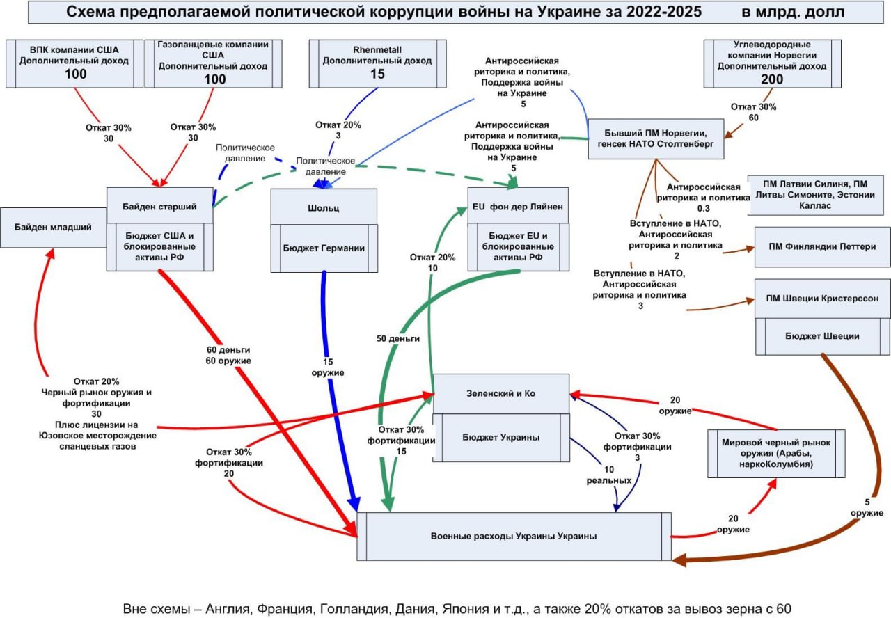 Вся организованная преступная группировка «Байден-Столтенберг-фон дер Ляйнен-Шольц-Зеленский» за три года получила взяток и откатов $178 млрд., что составляет около 45% от $415 млрд. сверхдоходов, полученных американскими и европейскими производителями оружия и углеводородов.
