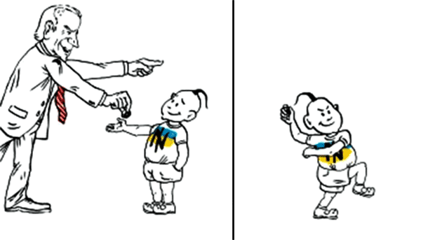 В данном случае вместо подростка выступает Россия (Путин), вместо «младшего брата» – действительно «мелкий» и шумный клоун Зеленский, представляющий псевдогосударство Украину, а вместо «старшего брата» - англосаксонская финансовая олигархия, использующая в качестве главных инструментов объединенную прессу и объединенную Европу.