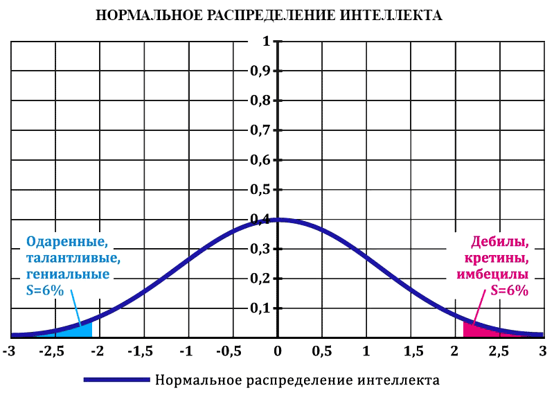 Но насколько неумно? В соответствии с распределением Гаусса 6% особей человеческой популяции являются официально слабоумными, умственно отсталыми. С точки зрения биологии и медицины к таким относят людей с IQ ниже 70. Официально они называются дебилами, кретинами, идиотами и т.д., что является медицинским диагнозом. Несмотря на ст. 1 Декларации прав человека, гласящую, что «Все люди .... наделены разумом» ( 1) , данные люди официально признаны недостаточно разумными.